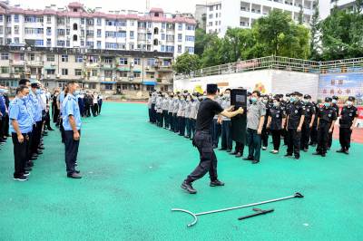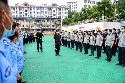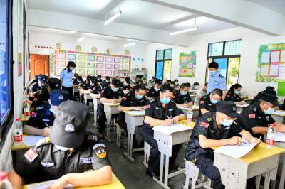 2020年7月2日,保康民警正在对保安从业人员进行警械使用技能培训和从业资格理论考试。