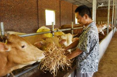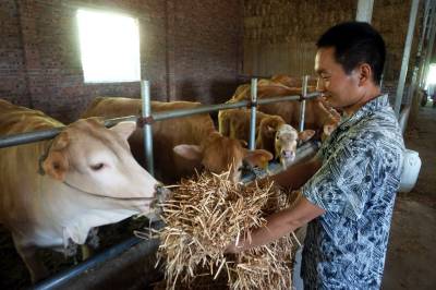 2020年7月2日,十堰市郧阳区南化塘镇罗堰村39岁的村民曹立平正在为自家的100多头黄牛定时喂料。曹立平2010年开始试着喂养黄牛,经过几年来的不断摸索总结出一套山区黄牛散养和圈养的方法,2019年在区水利和湖泊局驻村工作队的大力支持和帮助下为曹立平建起了养牛场,曹立平当年出栏30多头成品牛创收60多万元,并安置5位村民在养牛场上班,成为该村带领村民致富的领头人。