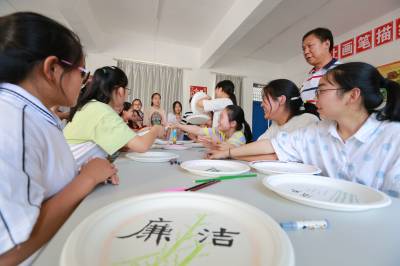 “以廉为荣,清正在德。”“走好廉洁阳光道,拒绝腐败独木桥。”“出淤泥而不染,濯清涟而不妖。”“咬定青山不放松,立根原在破岩中。千磨万击还坚劲,任尔东西南北风。”“不修其身,虽君子而为小人;能修其身,虽小人而为君子。”“鱼为诱饵而上钩,人为贪欲而落网。”……7月2日,湖北省竹山县宝丰镇黄栗九年一贯制学校学生利用纸盘绘“廉”画,尚廉崇洁,润泽心田,这是该校开展“廉”进校园活动的一个缩影。