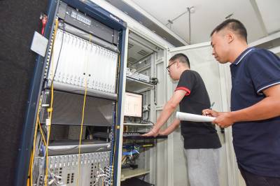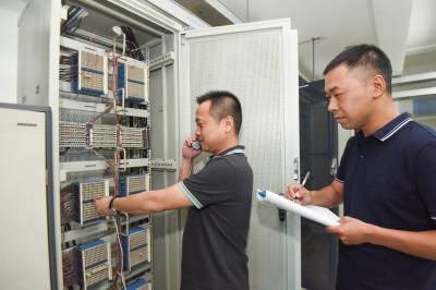 7月3日,在荆州市长江河道管理局通信总站,工作人员在检测防汛专线线路通畅情况。