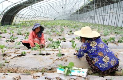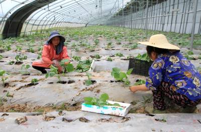 7月7日,房县化龙堰镇长望村留守妇女在家门口的全国巾帼脱贫示范基地生态蔬菜园移栽黄瓜秧苗。房县施行“村村有产业、户户有项目、人人有事干、劳动有收入”的就业扶贫模式,发展食用菌、黄酒、高山反季节生态蔬菜等支柱产业,吸纳农民就业,促进增收致富。目前,全县建成各类特色产业基地134.8万亩,带动农民就业增收达11.8万人。