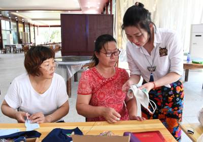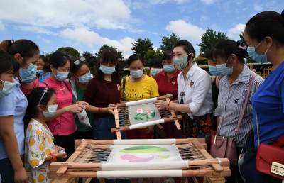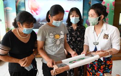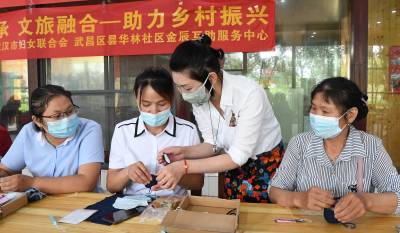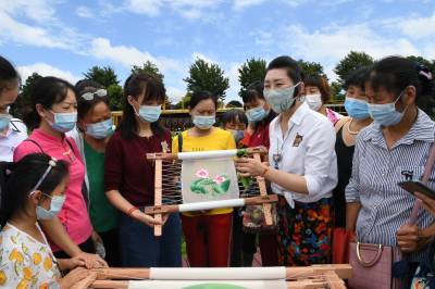 7月8日,立志传承非遗文化的金辰和她的公益团队伙伴李红芳、程琳再次走进新洲区仓埠紫薇都市田园,为25名贫困农户妇女进行汉绣技艺培训。