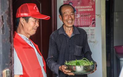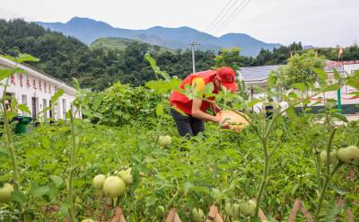 2020年7月7日,竹溪县鄂坪唐家畈村新时代文明实践志愿服务队党员志愿服务者唐吉德等,为行动不便和弱智五保老人李茂贵等在“爱心菜园里摘茳豆等蔬菜。”
