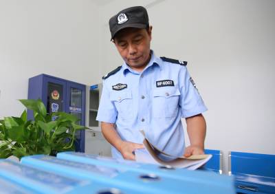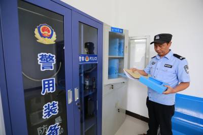 7月14日,笔者走进湖北省竹山县宝丰镇下坝村警务室,头盔、强光手电、防暴叉、警棍等防护装备样样俱全。下坝村辅警何海军在警务室里查看监控,整理档案,接待来访群众,工作井然有序。