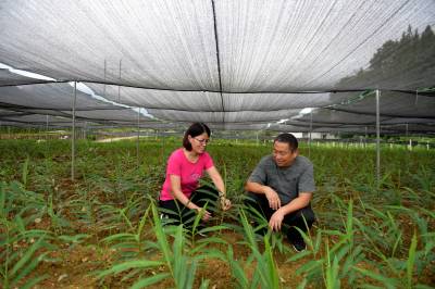 7月16日,农业农村部定点扶贫县产业技术顾问组专家(女)在来凤县绿水镇香沟村传授凤头姜绿色栽培技术。
