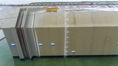本次注水将分两次进行,先注水到5米后将进行低水位端封门、沉管底板密封性检测,第二次将注水到9.7米,进行高水位的沉管结构及端封门水密性检测,检测完成后松开地锚系统系揽,校核沉管干舷高度,各项测试完成后进行干坞排水,浇筑压舱混凝土,确保沉管干舷安全可控,为下一步的浮运安装做准备。