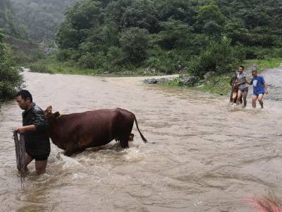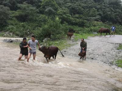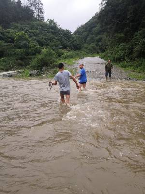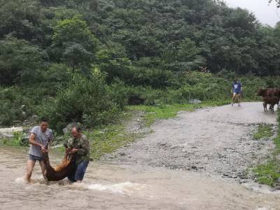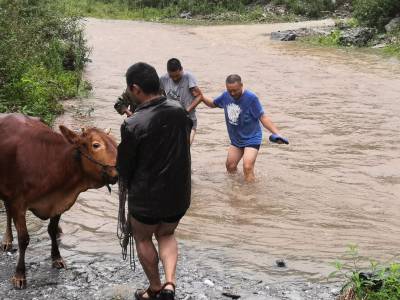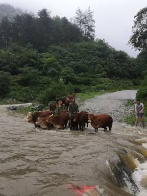 7月17日中午,暴雨再次向田畈村杨家院扶贫安置点袭来。贫困户熊聚德发现河沟水位暴涨,无法带着16头牛涉水过河。情急之下,他拨打电话向村干部和驻村扶贫工作队员寻求帮助。接到求助电话后,村干部和驻村扶贫工作队员迅速带着绳子赶往安置点山脚下。驻村扶贫工作队员赵璐、张正波冒着大雨,蹚水过河,帮助熊聚德将大牛赶过河、小牛抬过河。