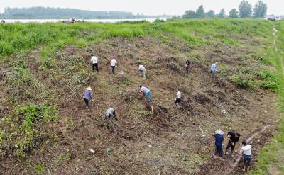 7月24日,在位于长江支流虎渡河西岸的荆州区弥市镇,镇村党员群众在合力处置虎西支堤新堤段面的散浸险情。