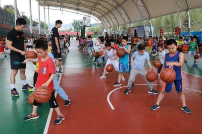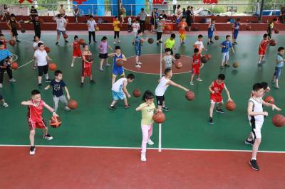 7月29日,竹山县100多名孩子来到堵河广场露天篮球场上,在龙飞体育团队教练的辅导下进行篮球练习。