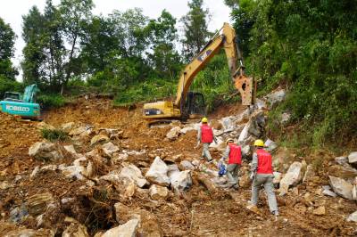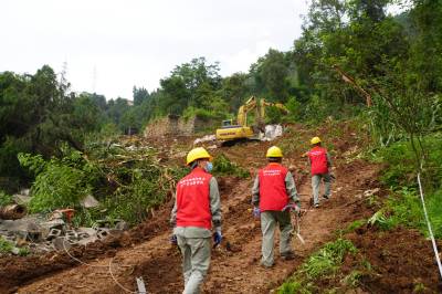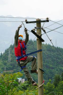 7月29日,在巴东县信陵镇云沱社区七组,供电员工冒着高温拆除滑坡区域内电力设施,以确保滑坡区域供电安全。