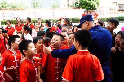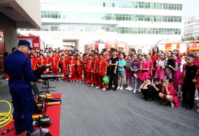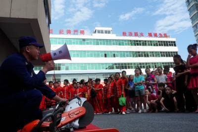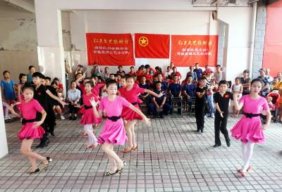 2020年7月31日,十堰市郧阳区的小演员们正在为消防指战员表演舞蹈,庆祝建军93周年。这是该区总工会、团委和妇联志愿者组织的慰问演出活动。小演员们还观看了消防救援装备演示操作。
