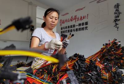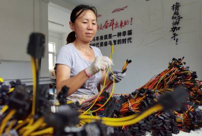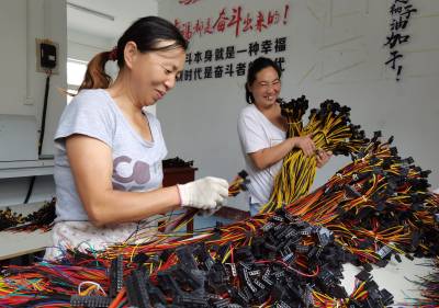 2020年7月31日,房县军店镇双柏村易地搬迁安置小区农民魏平(左)在家门口的兆丰电子扶贫车间检查电脑电源线插孔安装质量。房县实施“优惠政策挺进、金融信贷跟进、企业辐射带动”的扶贫模式,将扶贫车间、作坊搬进乡村,增强农民脱贫致富的带动力。目前,全县建成电子、制鞋、服装加工等扶贫车间、家庭作坊2000多个,带动贫困农民4080人增收脱贫。