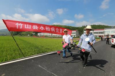 8月3日上午,竹山县农业农村局植保站组织农业技术员,深入宝丰镇双庙村利用无人机进行水稻病虫害防治。
