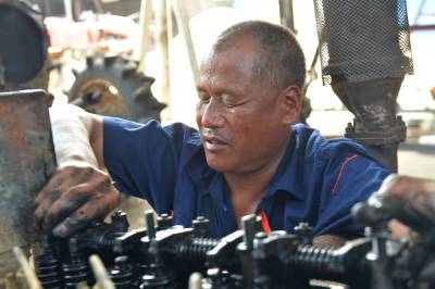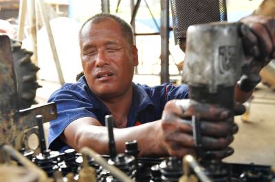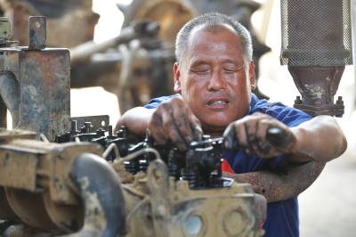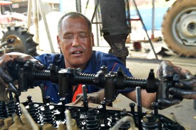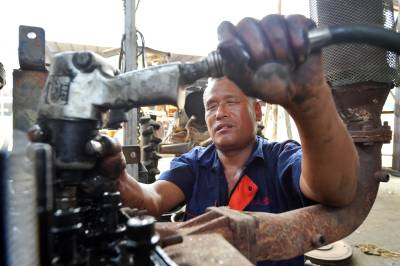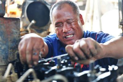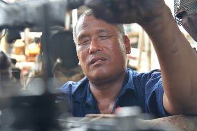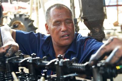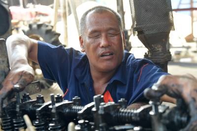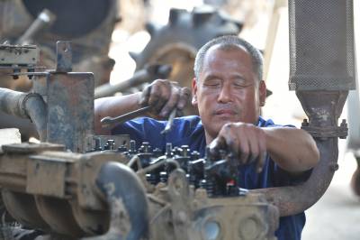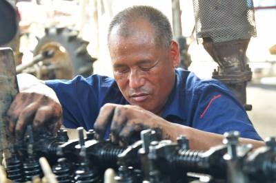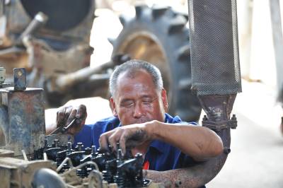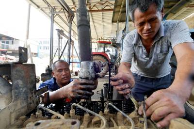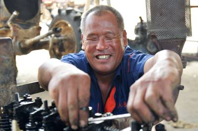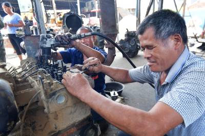 8月4日,中伏第十天,室外气温36度,在襄州区古驿镇“盲人修车”修理部,盲人兄弟周付喜(左)、周成喜(右)在抢修一台东方红拖拉机,几分钟过后,他们的衣服全部被汗透,到11点,这台急用的拖拉机完成维修,进入安装阶段。今年疫情过后,兄弟俩开始接待顾客,目前已经维修了200多台农机。