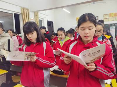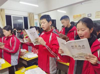 “楚塞三湘接,荆门九派通。江流天地外,山色有无中。”12月21日,竹山县潘口乡中学八年级学生阅读社会主义核心价值观学生读本《朝读经典》。
