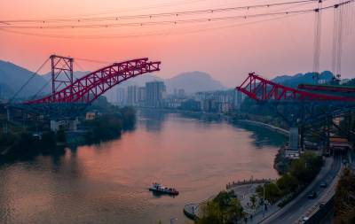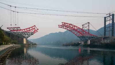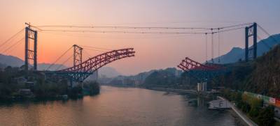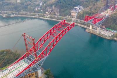 湖北长阳清江特大桥位于宜昌市长阳土家族自治县龙舟坪镇,是龙(舟坪)五(宜都市五眼泉镇)一级公路跨越清江的控制性工程,该项目是国家武陵山少数民族经济社会发展试验区交通建设的重要项目之一。清江特大桥全长354.8m,主桥为320m飞燕式钢桁架系杆拱桥,采用双向4车道,设计时速60公里/小时,桥梁采用斜拉扣挂法施工,使用一套最大起重量80吨的缆索起重机进行上部钢结构安装,拱肋共分20个吊装节段,2个合拢节段,预计2021年春节前主拱圈合龙,9月全线通车(视界网 王耿 摄)。