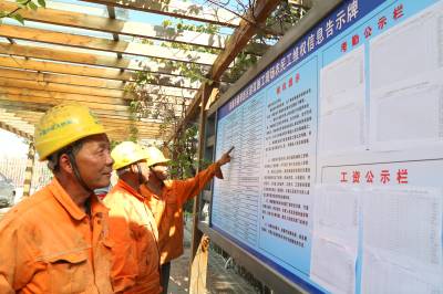 岁末年初,这时候农民工最期盼的就是能够拿到工钱回家过年。为了更好维护员工(农民工)的合法权益,项目部认真贯彻落实上级相关维权工作的指示精神,在项目部醒目位置设立了维权信息告示牌、工作考勤和工资发放清单公示栏。告示牌内容有工程名称,建设单位及负责人、电话,施工单位及负责人、电话,当地建设主管部门及地址、电话,当地劳动保障监察机构及地址、电话,当地劳动争议调解仲裁机构及地址、电话,当地法律援助机构及地址、电话,人力资源和社会保障服务热线,当地最低工资标准等。