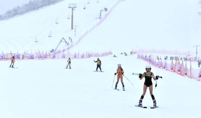 12月29日,4名比基尼装着的滑雪爱好者在神农架国际滑雪场滑雪。 神农架全年降雪丰沛,储雪期长,雪质蓬松、气温适宜、环境优美。国际滑雪场海拔高度2230—2380米,雪场冬季月平均气温为-4℃,着装比基尼滑雪,也不感觉寒冷。