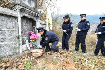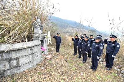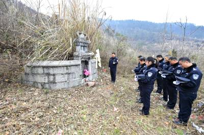 2021年1月6日,在保康县马良镇宋家湾村,民警正在二级英模周友国墓前祭奠,向英雄表达敬意。