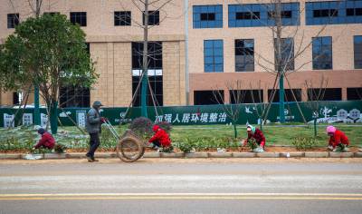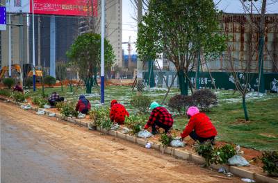 黄梅园林工人冒雪施工治环境