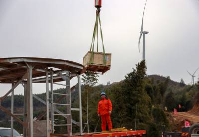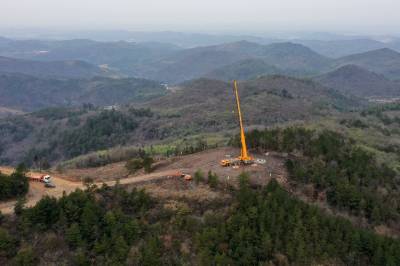 (吴涛 聂国力)1月7日,咸宁市咸安区大幕乡白云山风力发电项目现场,施工工人们正在紧张有序调 试专业吊装设备,准备进行风机吊装作业。