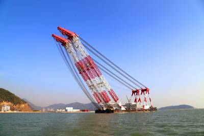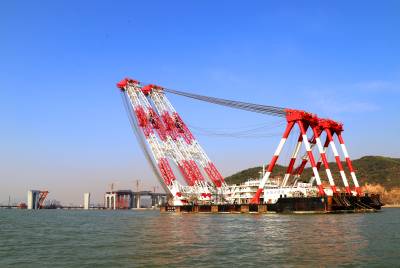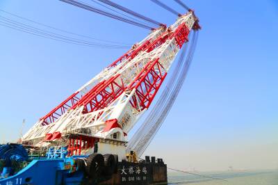 报珠海讯(通讯员孟庆虎 江海明)1月14日,目前国内起重量最大、起升高度最高的双臂架起重船,“大桥海鸥”号3600吨起重船缓缓使进中铁大桥局珠机城际金海大桥工地,为即将开始的钢梁钢塔架设奠定了坚实的基础。