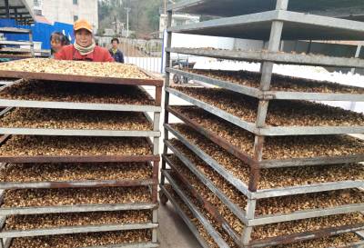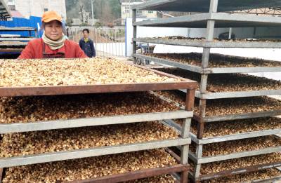 2021年1月16日,房县军店镇双柏村中药材合作社社员在加工葛根丁。该县实施“园区带动产业+产业带动基地+基地带动农户”的举措,发展北柴胡、白芨等地道名优中药材,促进乡村振兴,助力农民增收。目前,当地中药材种植面积超过50万亩,年均实现产值20亿元,中药材北柴胡、白芨、绞股蓝、虎杖通过国家地理标志产品认证,一批中药材制成产品远销日本、韩国等海外17个国家和地区,带动10万农民增收致富。