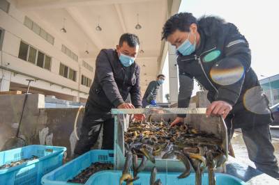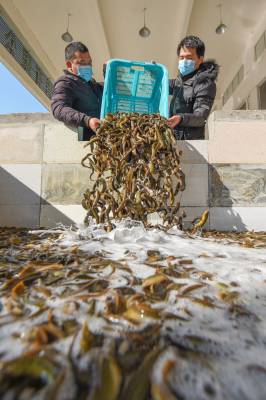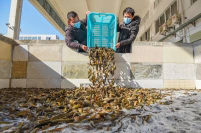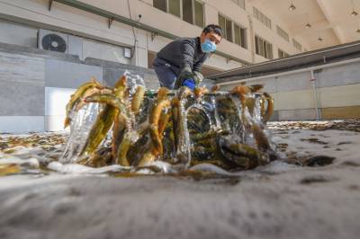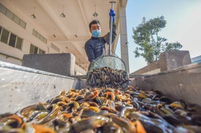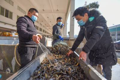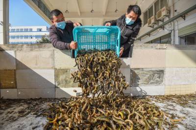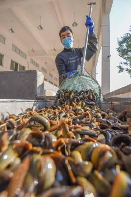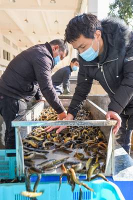 2021年1月19日,在国家级湖北荆州淡水产品批发市场,商贩正将泥鳅分装到氧灌车及时发运,以满足春节期间的市场供应。