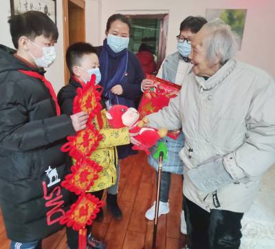 1月20日,农历廿四个节气中的大寒与民俗传统腊八佳节喜相逢。当天下午,武汉市江汉区单洞新村小学10余名党员教师和少先队员代表,来到下沉邻居的新华街单洞社区,共同开展了迎新春送温暖寒假里的首个社会实践献爱心活动。他们带着全校师生深情厚意,上门看望了社区两位老寿星。同时,为社区10个特困家庭圆了防疫迎新年的微心愿,为他们赠送了口罩、消毒液、新书包、吉祥牛、福字等新春用品。