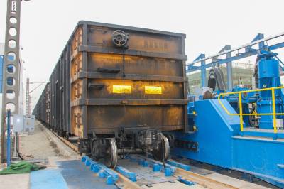 1月20日,国家铁路集团中车青岛四方公司正在对荆州煤炭铁水联运储配基地翻车机及附属设备与C80B车型进行匹配性能检测。