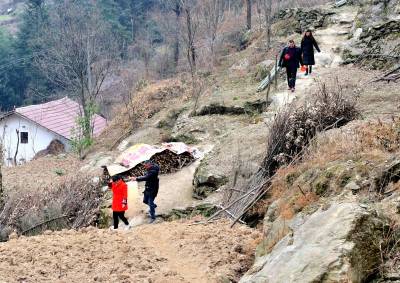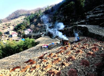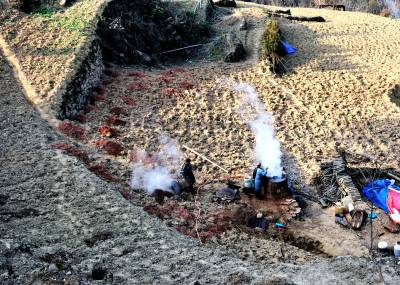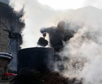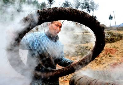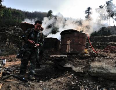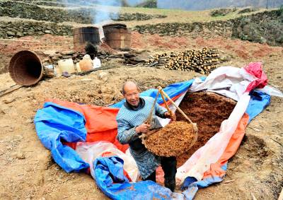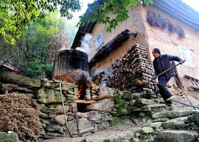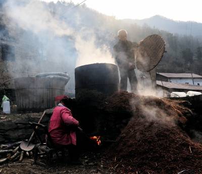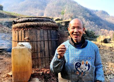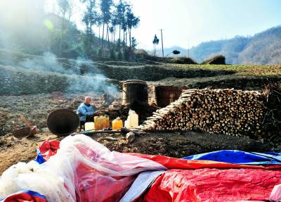 2021年1月21日,湖北省十堰市郧阳区胡家营镇焦园村三组村民郑自悌在家门口的山坡上利用土法烤酒,山村处处弥漫着浓浓的酒香。