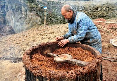 所谓土法烤酒,即用火将玉米、甜杆、柿子等蒸热发酵后进行蒸馏而成酒的民间技艺。烤酒器具有大、小铁锅各一口,一作底锅,一作天锅,木制酒甑一只,引酒管一根,贮酒器一个。其过程是将玉米、甜杆、柿子等蒸热,拌上小麦酒曲埋入地窖发酵两个半月,然后放进木制酒甑,加火使发酵的玉米、甜杆、柿子等形成酒蒸气,酒蒸气通过天锅冷却进入引酒管,遇冷形成酒液。
