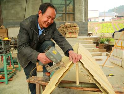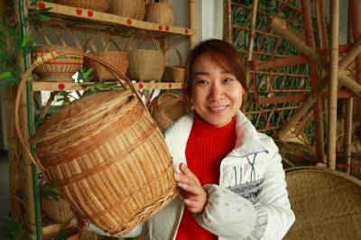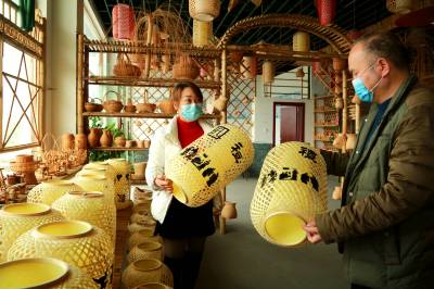 2021年1月25日,在竹山县溢水镇非物质文化遗产—老篾匠农村手工竹编工艺合作社里,一顾客正在购买竹编花篮。竹山县有丰富的竹木资源,近年来,为让濒临失传的传统手艺重新焕发生机和活力,溢水镇政府将老篾匠编织技艺作为扶贫产业来抓,鼓励农民成立合作社,从事竹编手工艺品制作、加工、销售、运输、储藏等,打造非遗文化产业,精美的竹篾生活用品绿色环保,美观大方,深受消费者喜爱,产品远销北京、武汉等地。