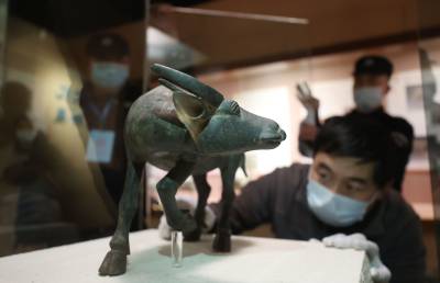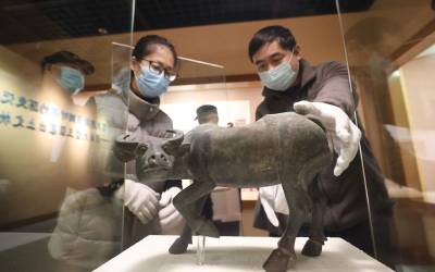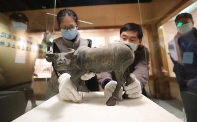 2021年1月29日,在湖北襄阳市博物馆,工作人员在布置十二生肖迎新春系列的“牛”文物特展。当日,为迎接农历辛丑年(牛年)即将到来,湖北省襄阳市博物馆将于1月30日推出十二生肖迎新春系列特展——“牛”转乾坤,通过15件珍贵藏品展现“牛”历史,为广大市民奉上一场文化盛宴。