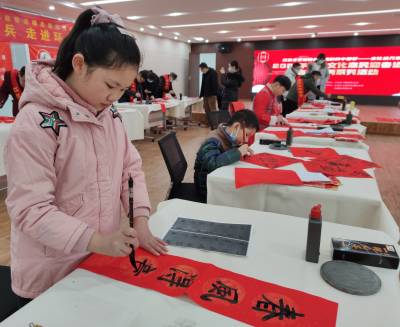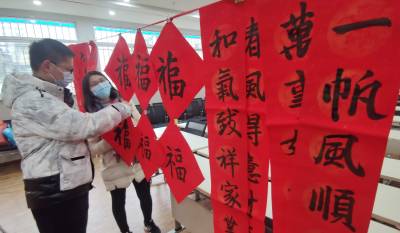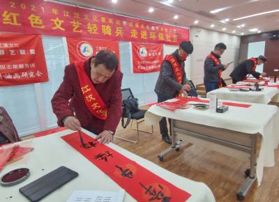 2月1日,武汉市江汉区文化馆党支部,组织红色文艺轻骑兵走进了共建单位北湖街环保社区,来自该区退休老干部、放寒假的小学生、文艺爱好者等,作为文化服务志愿者,他们共同在社区文化活动室,挥毫泼墨,把火红的对联写起来了,大大小小的福字挂起来了,喜迎新春牛年到的翰墨飘香了环保社区,让“我们的中国梦”——文化进万家。为了做好疫情防控不引发人群聚集,此次文艺轻骑兵进社区活动,没有发动社区居民参与,而是通过区文化馆和环保社区党员干部一对一上门的方式,将春联和“福”送到居民的家门口。