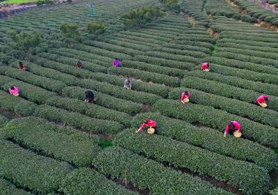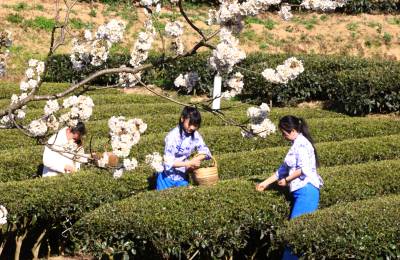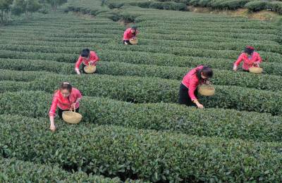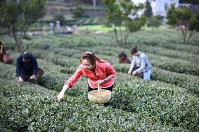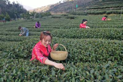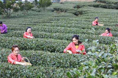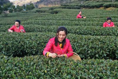2021年2月19日位于三峡库区的湖北省宜昌市夷陵区太平溪镇韩家湾村沿江早茶基地的茶农正在采摘早春茶,至此三峡库区的秭归县、夷陵区早茶基地全部开园。从而拉开了宜昌百万亩茶叶开园的大幕。