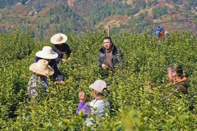 2月19日,春日茶园吐新绿,湖北省恩施州宣恩县农业技术人员趁着晴日,深入茶园为群众指导采摘技术、示范采摘技巧,及时通报周边茶企鲜叶收购行情,铆足干劲为本地群众做好新春各项农业指导服务工作。图为万寨乡农业技术指导服务人员正在为茶农示范采摘技巧。
