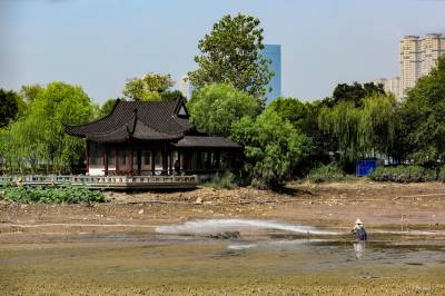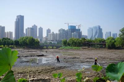 为了搞好沙湖水质,还百姓一片洁净的湖水,2020.7刚刚解除封城三个月,就开始内沙湖的清淤工程,工人们挥汗如雨,站在湖底淤泥中,用高压水冲击淤泥,再用泥浆泵将淤泥浆抽走。三个多月时间,内沙湖水质一新,航拍可以看出,沙湖水质清澈,风景如画。