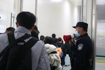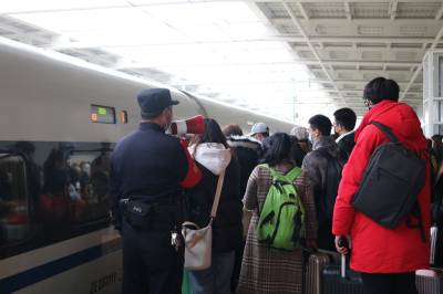 3月3日,为了维持旅客出行秩序,谷城北车站派出所民警用喇叭呼喊,让旅客按秩序乘车,小心脚下安全。