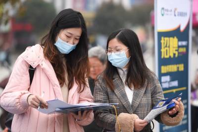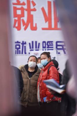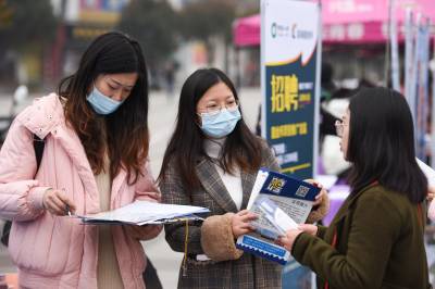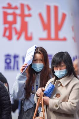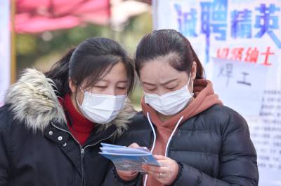 2021年3月4日,湖北省荆州市,求职者在招聘会上求职。