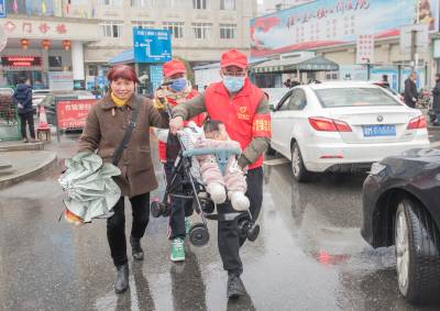 3月5日学雷锋日,荆州市三医院学雷锋志愿者服务队冒雨上街为市民服务。学雷锋志愿者看见一位带婴儿的婆婆艰难的在车流中穿梭,于是主动上前抱起婴儿车将婆婆一行送过马路。