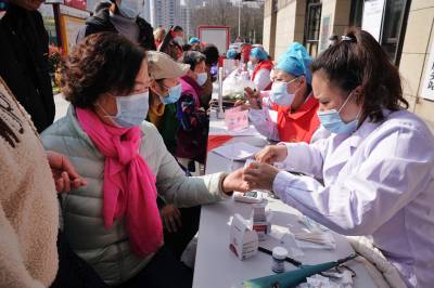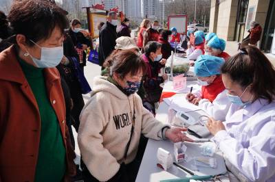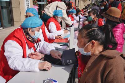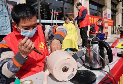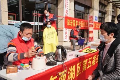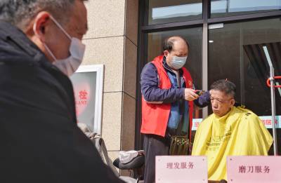 2021年3月4日,在武汉市东西湖区金银湖街花城社区门前,健康义诊、家电维修、理发、户籍咨询等志愿服务正在有序进行,深受辖区居民欢迎。为迎接第58个“学雷锋纪念日”,该社区开展学雷锋便民志愿服务,进一步推进志愿服务常态化发展。(湖北日报全媒记者 倪娜 摄)