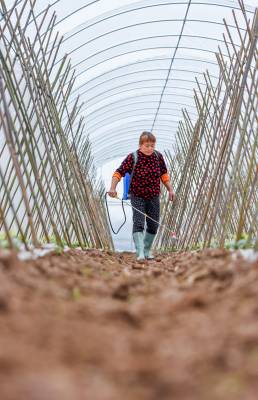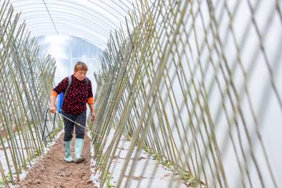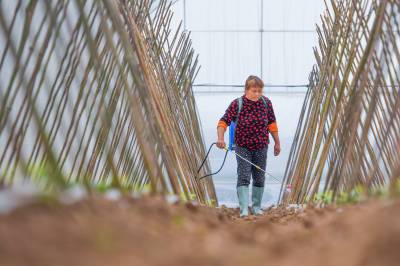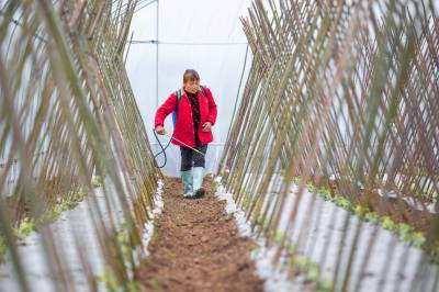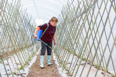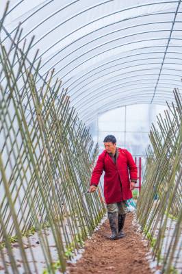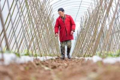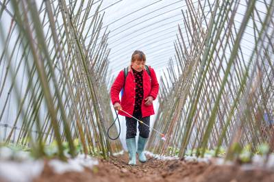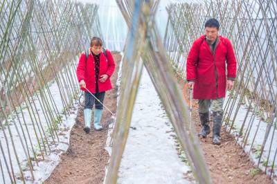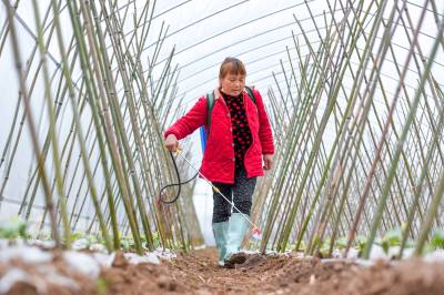 2021年3月5日,在湖北省荆州市荆州区弥市镇陈家湾镇的蔬菜大棚,农民在给豇豆苗喷洒保苗肥。