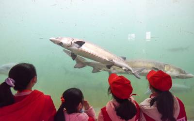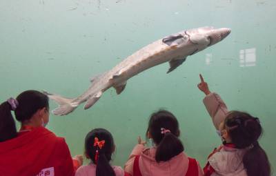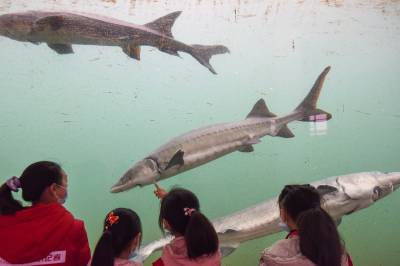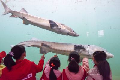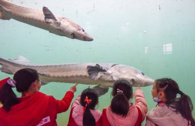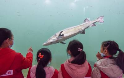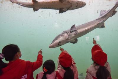 2021年3月6日,湖北荆州,在中国水产科学研究院长江水产研究所荆州太湖中华鲟保育基地,小学生在了解中华鲟习性。
