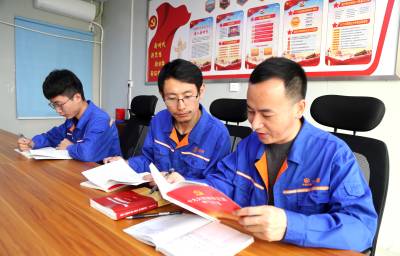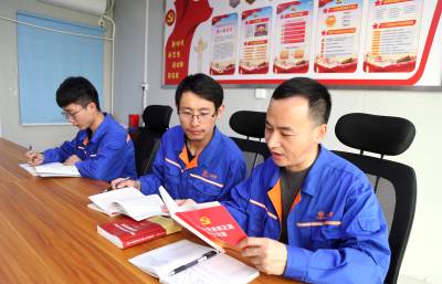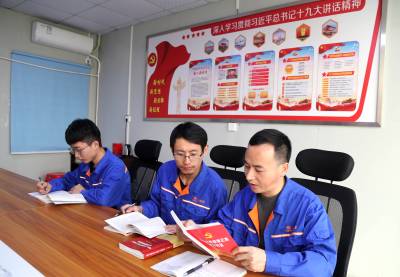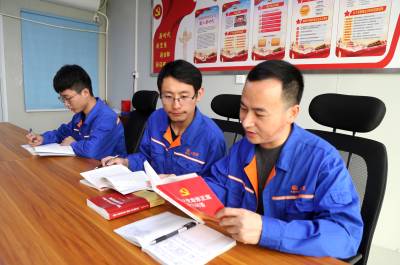 本报珠海讯(通讯员孟庆虎 许 鸣) 3月12日,中铁大桥局珠机城际铁路金海大桥项目部党员王年华、入党积极分子江海明等人在党员活动室学习中国共产党党史。(图片右一为王年华,中间为江海明)