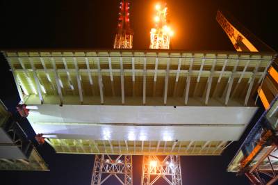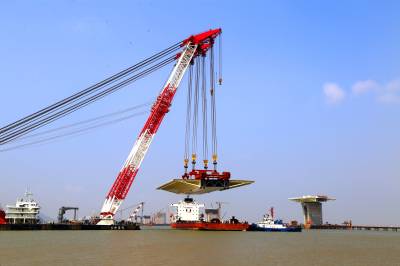 金海大桥边跨钢箱梁从24号墩至26号墩,由三大吊钢箱梁组成。即24号墩至25号墩钢箱梁,长80.25米,宽50.2米(含封嘴),重2608吨,是全桥最重的一块钢箱梁;26号主塔墩0’号梁段,长46米,宽50.2米(含封嘴),重2000吨;本次合龙块钢箱梁长72米、宽50.2米(含封嘴)、高4.7米、重2388吨。三大吊钢箱梁全部采用3600吨“海鸥号”起重船进行整体吊装,此次边跨成功合龙为后续钢箱梁架设奠定了基础,同时也获得了钢梁架设的宝贵经验。