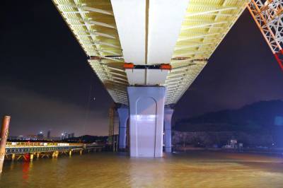 本报珠海讯(通讯员孟庆虎 江海明) 3月14日23时55分,随着重2388吨的钢箱梁精确就位,由中铁大桥局承建的珠海珠机城际铁路金海大桥首个边跨(横琴侧)钢梁成功合龙。