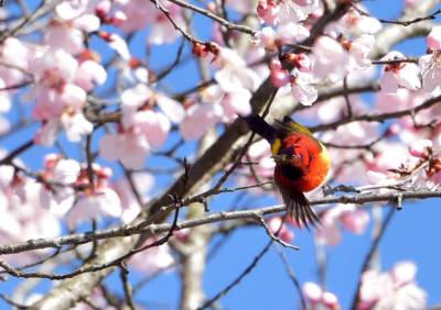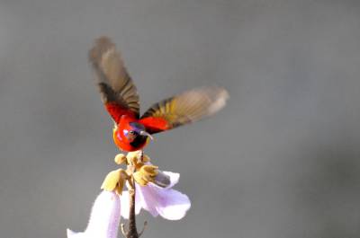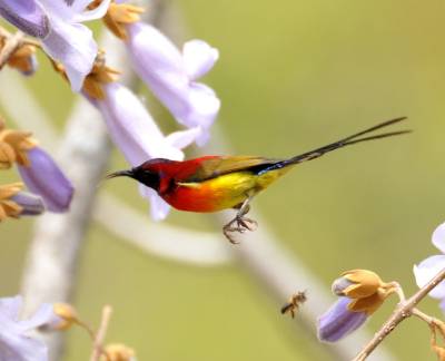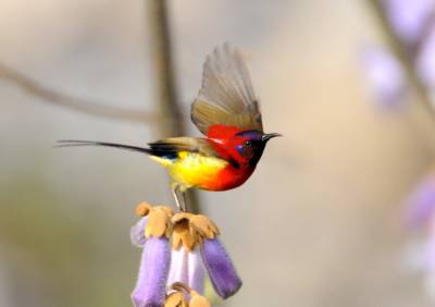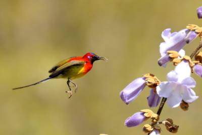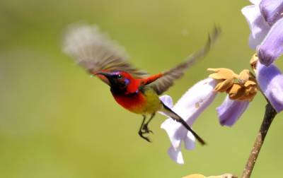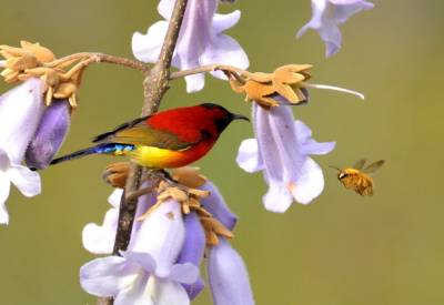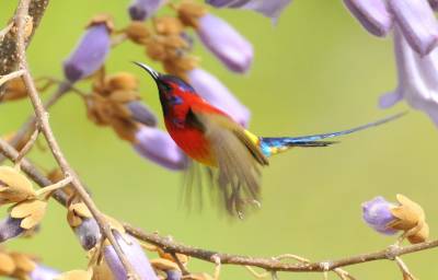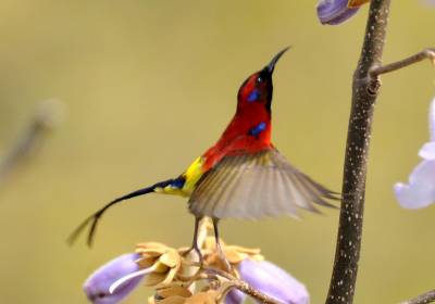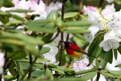 拉丁学名:Aethopyga gouldiae为鸟纲、雀形目 、太阳鸟科 、太阳鸟属,在神农架为留鸟。体长9.1—16厘米,体重4—12克。雄鸟色彩鲜艳,羽毛由红黄蓝三色组成,喉部蓝色突出,腰部和尾部也为深蓝色。雄鸟前额至后颈、耳后块斑、颏、喉绿色而具金属光泽,眼先、颊、头侧黑色,颈侧和背暗红色。肩和下背橄榄绿色,腰鲜黄色。夏季栖息于神农架海拔1000米以上的常绿林、落叶混交林中,冬季下迁。主要以花蜜为食,也吃昆虫等动物性食物。