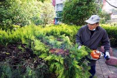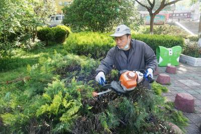 2021年4月15日,十堰市郧阳区园林所的园林工们正在郧阳文化广场修剪绿篱,以打造绿化、美化、净化、亮化的宜居城市,2020年十堰市被评为全国文明城市。