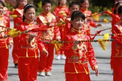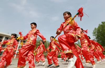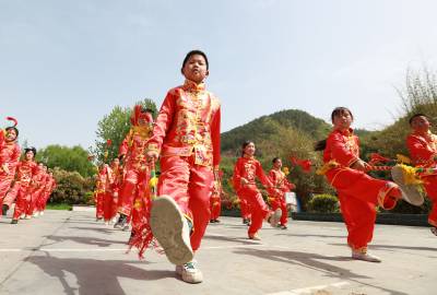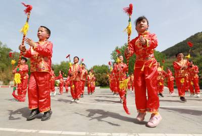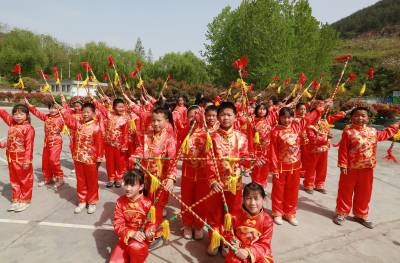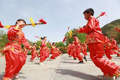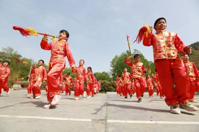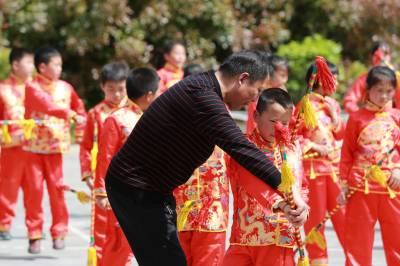 4月15日下午,竹山县宝丰镇黄栗九年一贯制学校四年级的学生,在教师沈行国的耐心指导下表演“打连厢”。孩子们以竹棒有节奏地敲打肩、臂、背、腿,操场上响起齐整悦耳的声音,十分壮观。